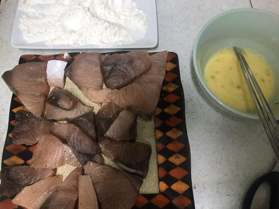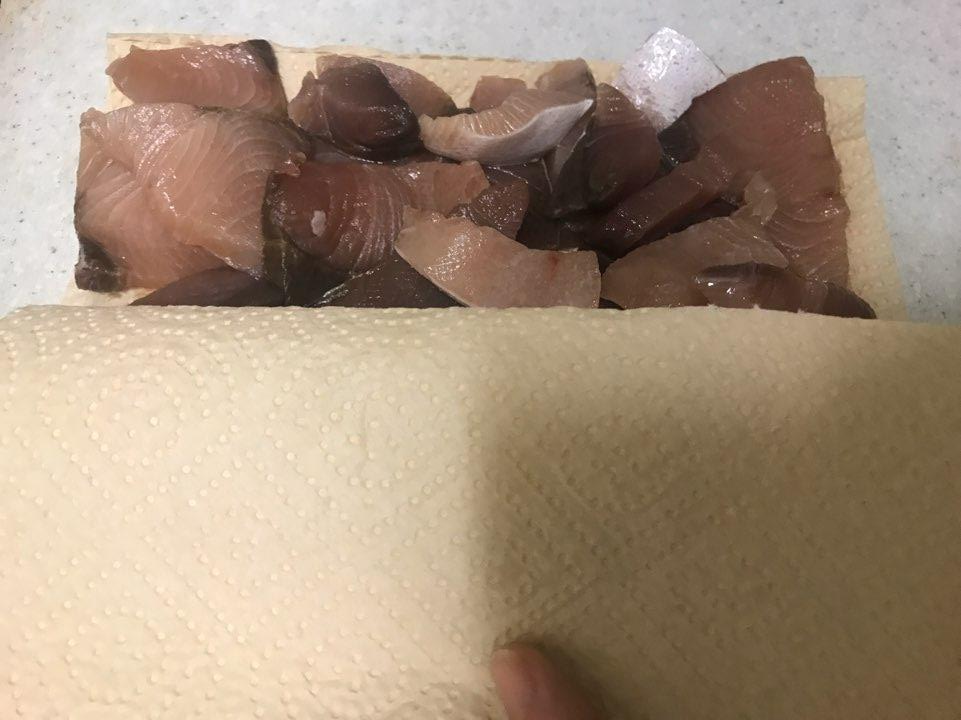 짠 이건 전으로 부쳐먹을 방어. 키친타올로 앞뒤로 잘 덮어 물기를 빼는 중임요.