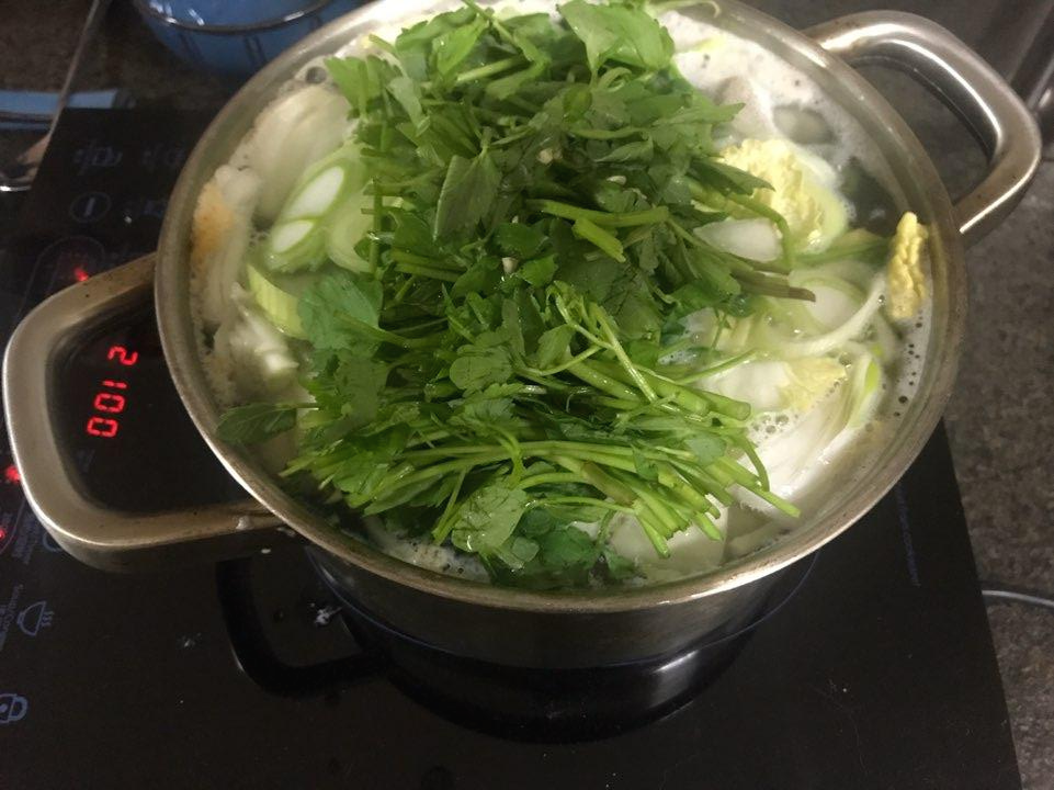 대구토막 건져 넣고 손질해둔 야채 넣고 마지막으로 미나리 푸짐하게 올려서 끓입니다.