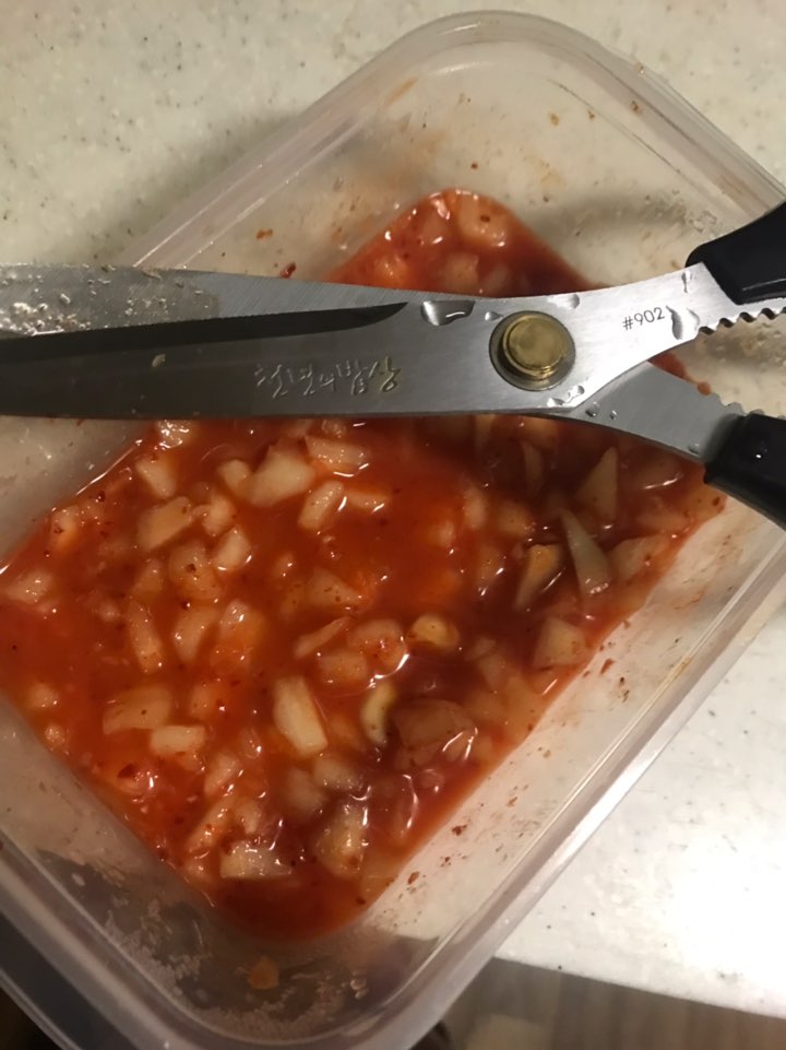 고게 남아서 깍두기 볶음밥을 만들기로 했어요. 도마가 물드는게 싫어서 가위로 잘라줬어요.