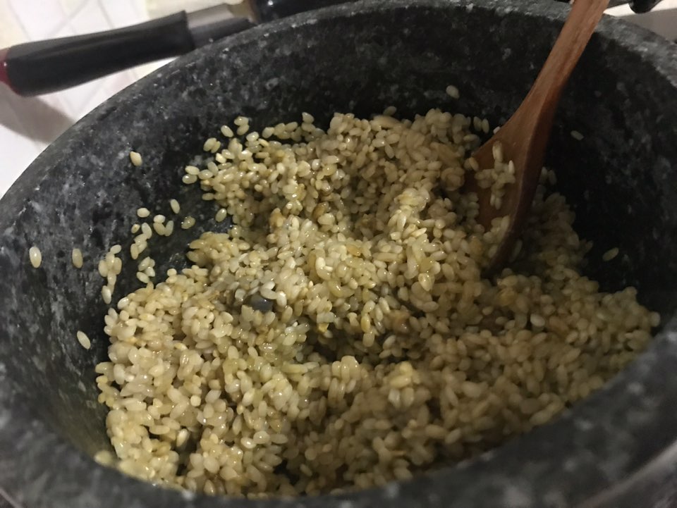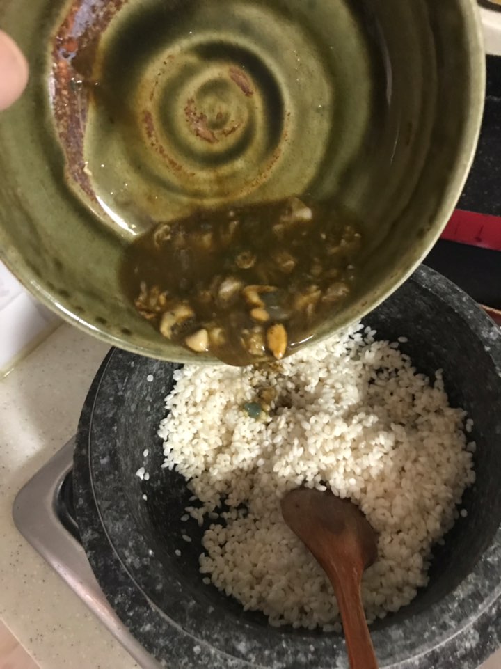 살짝 볶아서 전체적인 쌀이 따뜻하겠다 싶을때 전복내장을 부어줬어요