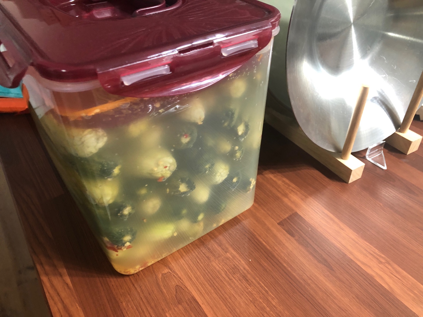 그러고 나면 물엿국물속에서 오이를 잘 건져내어서 원래의 보관해둔 소금물에 넣고
