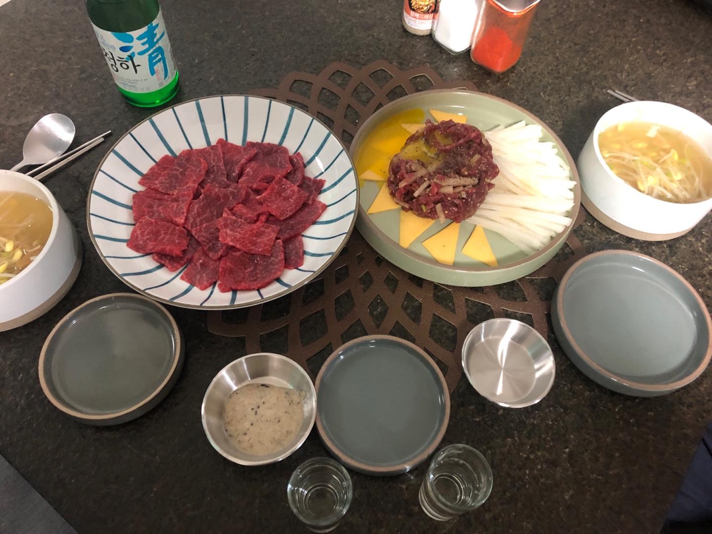 난 육회는 좀 무쳐서 먹으려고 미리 양념 준비해놓고 국 끓여놓고 같이 먹음.