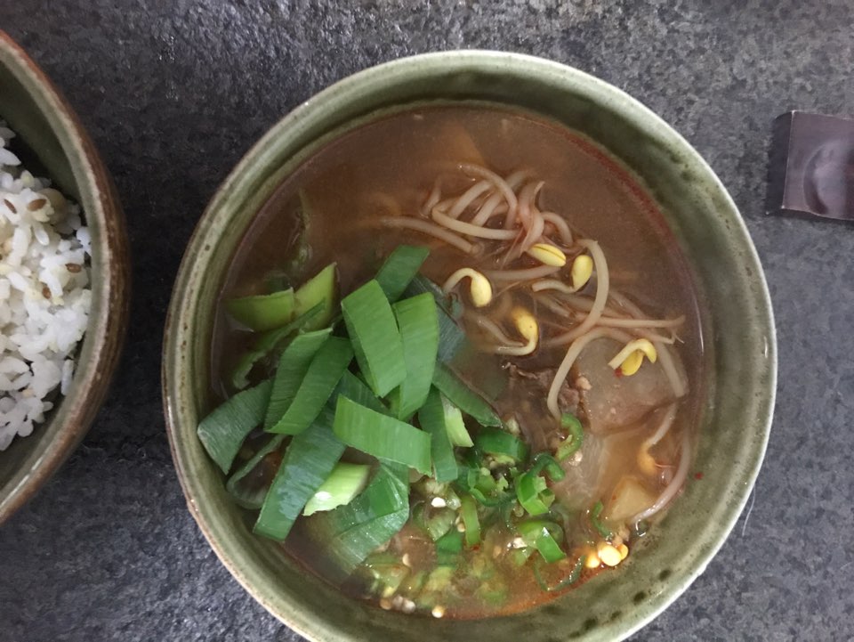 재료 : 쇠고기 300그람, 다진마늘 듬뿍 한큰술, 콩나물 한줌, 대파, 무 작은 한토막