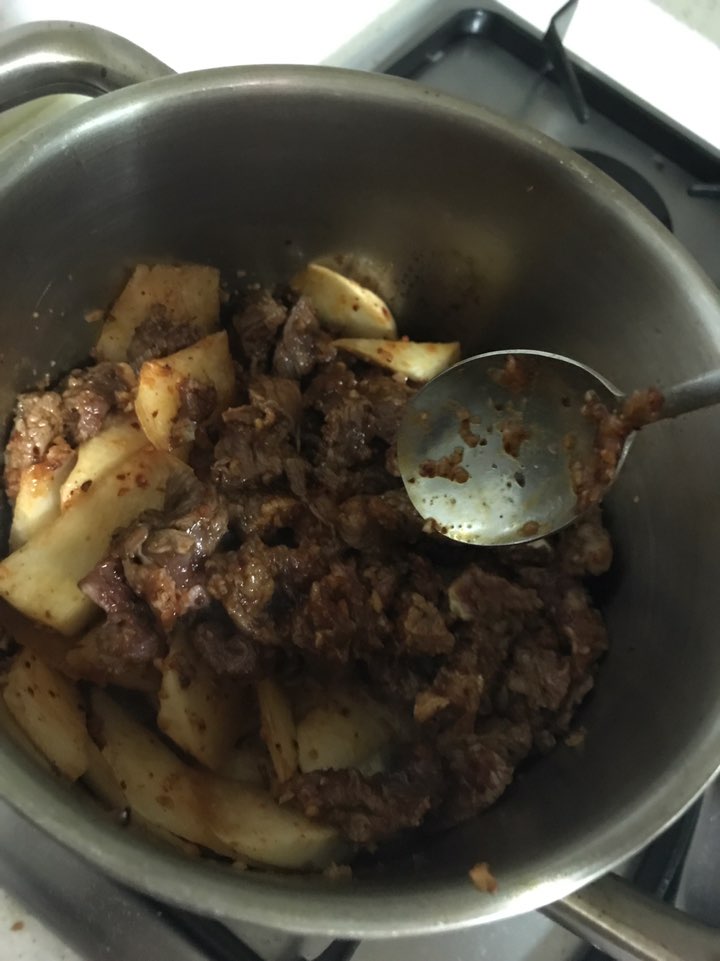 아직 불 켜지 마시고, 잔열이 있을때 소고기와 다진마늘 듬뿍 넣어서 잘 비벼서 잠시 두세요.
