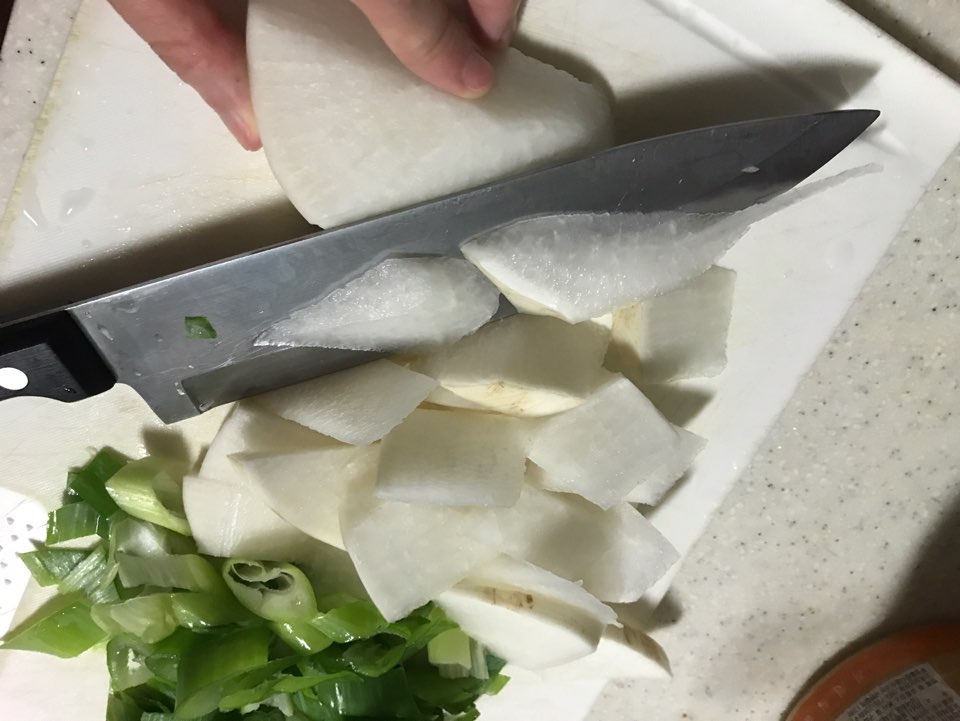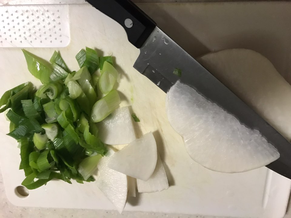 대파를 썰고, 무를 삐져 줍니다. 칼이 이상하게 들어가고 있죠?ㅋㅋㅋ